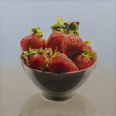 Aardbeien in witte kom | olieverf op paneel 90x90 cm 2025